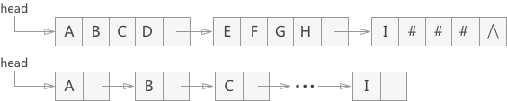 链表中最后一个结点的数据域不一定全被串值占满,通常会补上 “#” 或者其他特殊的字符和字符串中的字符区分开。每个结点设置字符数量的多少和存储的串的长度、可以占用的存储空间以及程序实现的功能相关。