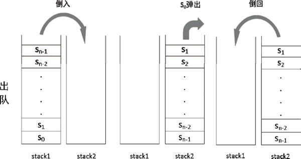 这个方案在入队时非常简单,而在出队时,多数情况下可以直接通过出队 stack2 实现,若需要把 stack1 中的元素倒入 stack2 中,则一般不用每次都进行这样操作。最坏的情况就是出队一个元素、入队一个元素这样的循环操作,导致每次出队都要转移元素。