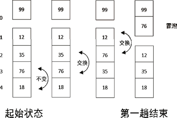 我们从后开始遍历,首先比较 18 和 76,发现 76 比 18 大,就把两个数交换顺序,得到 12、35、99、76、18;接着比较 76 和 99,发现 76 比 99 小,所以不用交换顺序;接着比较 99 和 35,发现 99 比 35 大,交换顺序;接着比较 99 和 12,发现 99 比 12 大,交换顺序。最终第 1 趟排序的结果变成了 99、12、35、76、18,排序的过程如图 1 所示。