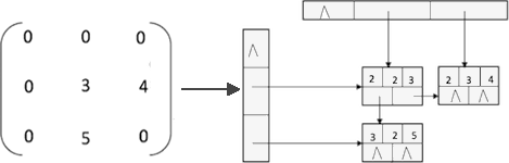 例如,对于图 3 的稀疏矩阵来说,即将(2,2,3)、(2,3,4)、(3,2,5)存储进 data 数组,并且存储稀疏矩阵的行数 3 和列数 3 ,该稀疏矩阵中非 0 元素有 3 个。行逻辑链接的顺序表