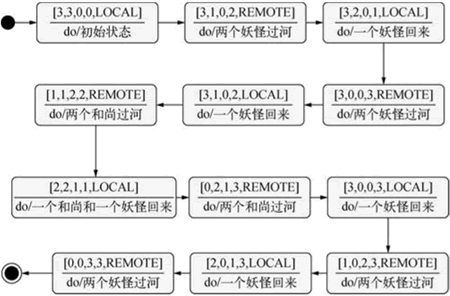 题目的初始条件是三个和尚和三个妖怪在河的一边,和它们在一起的还有一条小船。过河后的情况应该是三个和尚和三个妖怪安全地过到河的对岸,虽然没有明确提到船的状态,但是船也应该跟着到了对岸,否则岂不闹鬼了?我们看这个问题里的三个关键因素,就是和尚、妖怪和小船,当然,还有它们的位置。假如我们要让计算机理解这个问题,除了对这三个事物进行描述,还要定义它们的位置信息。如果把任意时刻妖怪、和尚和小船的位置信息合在一起看作一个“状态”,则要解决这个问题只需要找到一条从初始状态变换到终止状态的路径即可。我们可以尝试使用穷举方法,遍历所有由妖怪、和尚和小船的位罝构成的状态空间,寻找一条或多条从初始状态到最终状态的转换路径。