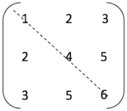图1 为 3 阶对称矩阵,图中的虚线为矩阵的 “主对角线” ,主对角线上方区域称为 “上三角” ;主对角线下方称为 “下三角” ,沿主对角线对称的数据元素一一相等,所以对于此矩阵来说,只需要存储 6 个元素即可。