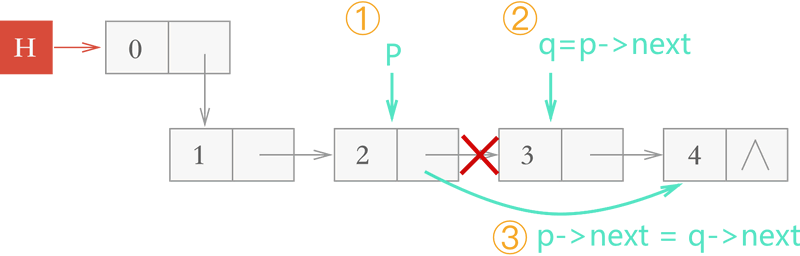 - 借助指针 p,可以顺利找到结点 3,因为它最终要被摘除,考虑到该结点占用的空间要手动释放,因此还要用一个指针 q 来标记它;