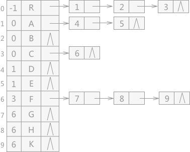 使用孩子表示法存储的树结构,正好和双亲表示法相反,适用于查找某结点的孩子结点,不适用于查找其父结点。可以将两种表示方法合二为一,存储效果如图 3: