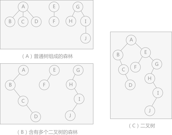 如图 6 所示,(A)中由三棵普通树组成的森林,首先三棵普通树采用孩子兄弟表示法各自转化成二叉树,如(B)所示;然后由(B)转(C)时,将森林中第一棵树的树根作为转化后的整棵二叉树的树根,其他数的树根作为第一棵树的树根的兄弟结点,如(C)所示。