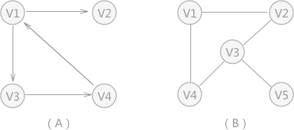 {V1,V2,V3,V4}。顶点之间的关系有两种:如图 1 中的两个图所示,(A)中顶点 V1 和 V2 只有单方向的关系,只能通过 V1 找到 V2,反过来行不通,因此两顶点之间的关系表示为: