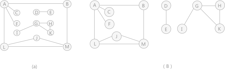 在无向图中,如果一个顶点到另一个顶点存在至少一条路径,称它们之间是连通的。 如果图中任意两个顶点之间都是连通的,则此图为连通图。例如图 1(B)就是一个连通图。 如果一个图本身不是连通图,但是图中某个子图是连通图,那么这个子图又被称为“连通分量”。注意:这里的“子图”指的是无向图中最大的连通子图。
