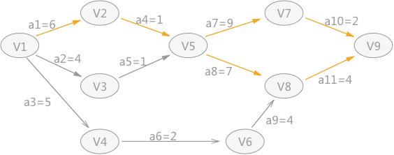 如图 1 所示就是一个 AOE 网,例如 a1=6 表示完成 a1 活动完成需要 6 天;AOE 网中每个顶点表示在它之前的活动已经完成,可以开始后边的活动,例如 V5 表示 a4 和 a5 活动已经完成,a7 和 a8 可以开始。