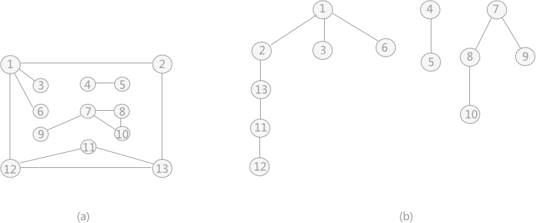 例如,对图 4 中的非连通图 (a) 采用深度优先搜索算法遍历时,得到的深度优先生成森林(由 3 个深度优先生成树构成)如 (b) 所示(不唯一)。