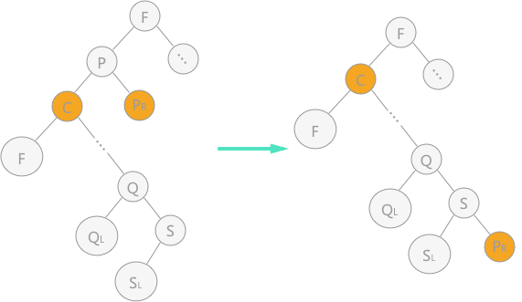 //判断结点 p 的左子树 s 是否有右子树,分为两种情况讨论