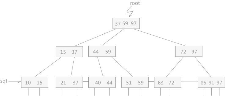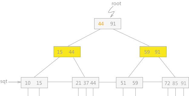 如图 1 所示,B+树中含有两个头指针,一个指向整棵树的根结点,另一个指向关键字最小的叶子结点。同时所有的叶子结点依据其关键字的大小自小而大顺序链接,所有的叶子结点构成了一个 sqt 指针为头指针的链表。