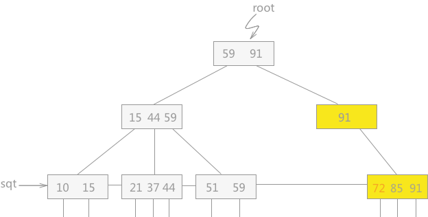 例如,在图 1 所示的 B+树中删除关键字 91,删除后的 B+树如图 5 所示:
