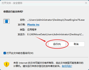 下载 CheatEngine76.exe 并双击启动,系统可能会弹出安全警告窗口,不用理会,点击运行即可: