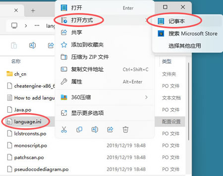 鼠标右键单击配置文件 language.ini,选择用记事本的方式打开它: