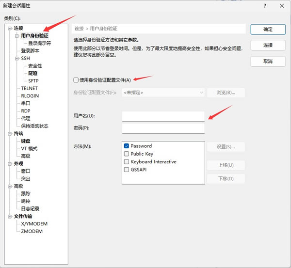 在“主机”栏输入 Linux 虚拟机的 IP 地址或主机名,“端口”栏默认为 22(除非你更改了SSH端口)。同时,我们还需要配置身份验证方式: