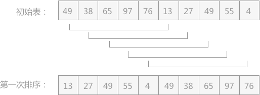 上图中两两进行比较,例如 49 和 13 进行比较,13<49,所以交换存储位置。