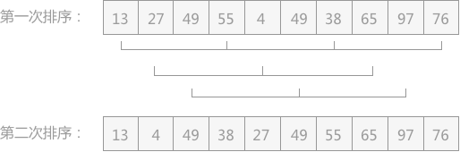 {49,38,65,97,76,13,27,49,55,4}进行希尔排序的过程为:- 首先对 {49,13},{38,27},{65,49},{97,55},{76,4} 分别进行直接插入排序(如果需要调换位置也只是互换存储位置),如下图所示: