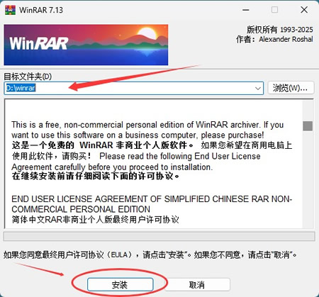 2) 默认安装到 C 盘,建议手动修改到其它盘(非系统盘),比如下图里我将其安装到了 D 盘的 winrar 文件夹里(最好指定一个具体的文件夹)。确定安装位置后,点击“安装”: