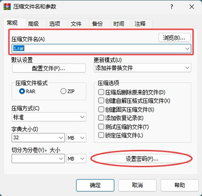 - ①:压缩的同时,可以自定义生成的压缩文件的名称,以及设置压缩文件的格式,可以选择 RAR 和 ZIP 两种;
