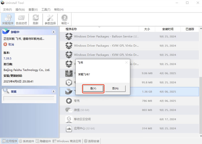点击【卸载】后,会弹出一个确认窗口,点击 “是”开始卸载操作。由于不同软件在卸载时会有不同的提示和操作要求,用户只需按照当前卸载软件所给出的具体提示,逐步进行相应操作即可。