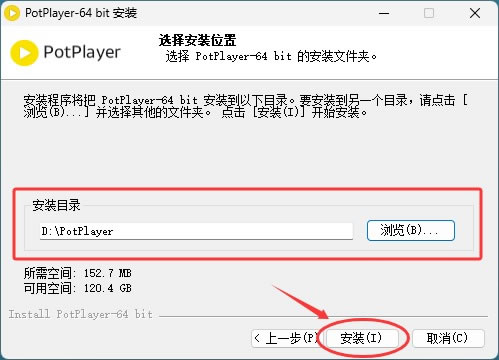 6) 默认安装到 C 盘,这里强烈建议修改到其它盘(非系统盘),比如下图中将其安装到了 D 盘的 PotPlayer 文件夹里。确认安装路径后,点击“安装”: