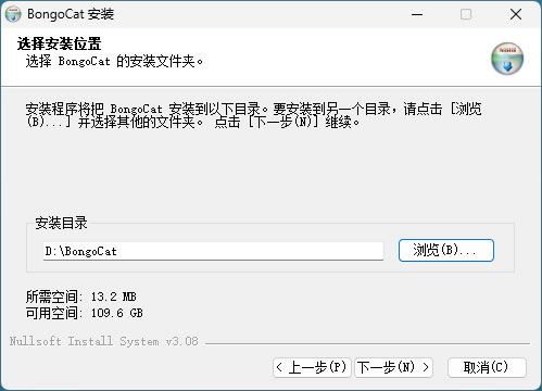 步骤二:安装向导会提示选择安装目录。默认位置是C:\Program Files\BongoCat,你可以点击"浏览"选择其他位置,比如D盘。