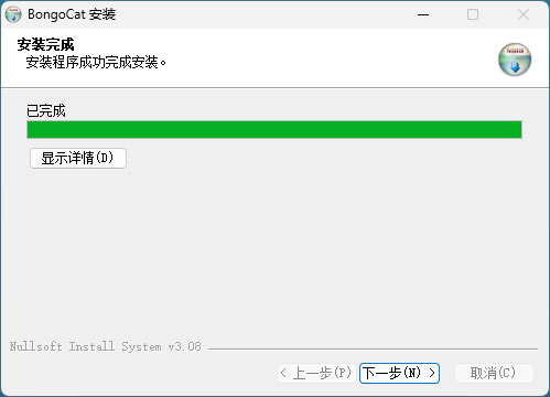 步骤三:点击"安装"按钮,等待进度条完成。安装过程通常只需几秒钟。完成后,你可以选择"立即运行BongoCat"来启动软件。