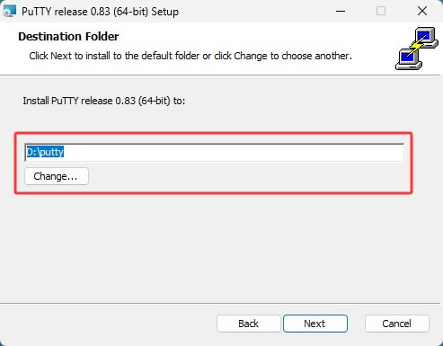 2)软件默认安装到 C 盘,这里强烈建议安装到其它非系统盘,比如下图中的 D 盘。建议创建专门的安装目录,如 D:\PuTTY,便于后续管理和维护。