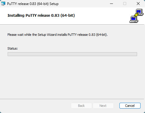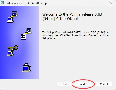 1)完成putty下载后,双击启动安装程序。安装文件名为 putty-64bit-0.83-installer.msi(也有32位版本的)。