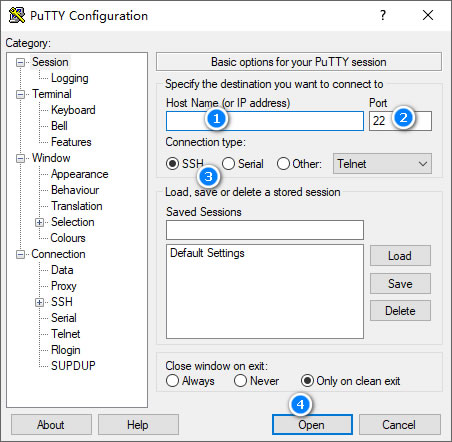 安装完成后即可开始使用 putty中文版进行远程连接。打开安装好的 PuTTY ,对照下图,按照如下步骤进行连接:
