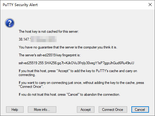 - 如果您信任此主机,请按“Accept”将密钥添加到 PuTTY 的缓存中并继续连接。