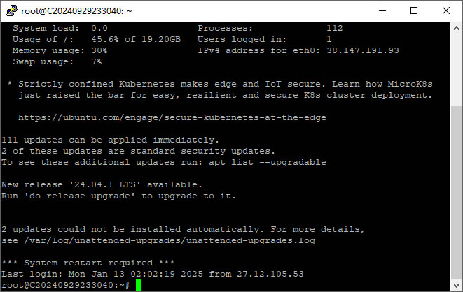 选择 “Accept”,输入用户名和密码。需要注意的是,输入密码的时候,是不会回显(屏幕上不出现任何字符,包括 * ),这是一个安全设计。出现类似以下界面,说明成功连接到Linux服务器了: