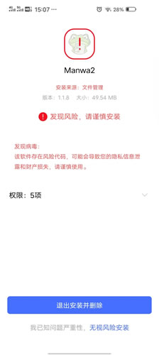 1) 下载名称为“Manwa2.apk”的安装包文件,建议直接用安卓手机打开下载链接,安装包就顺利下载到手机上了。2) 点击Manwa2.apk启动安装,系统可能会提示安装风险,点击无风险安装即可:
