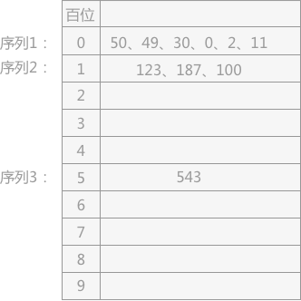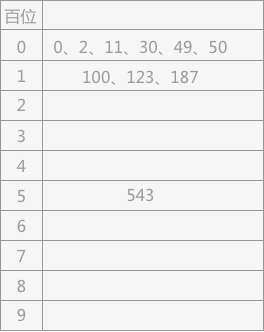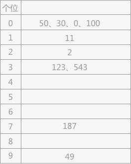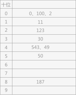 {50,30,0,100,11,2,123,543,187,49}。在该序列表的基础上,再按照各关键字的十位对各关键字进行分配,得到的分配表如下图所示:
