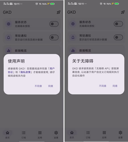 第三步,打开GKD,开启必要的权限,点击服务状态并开启它。这是最关键的一步,GKD需要无障碍服务权限才能正常工作。