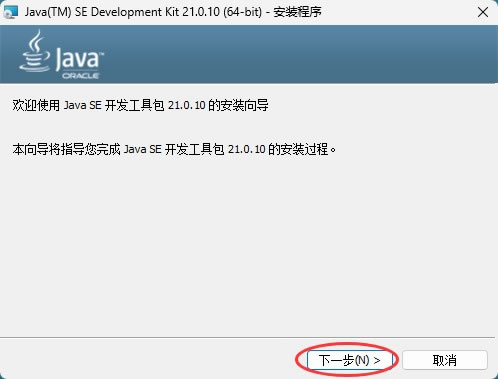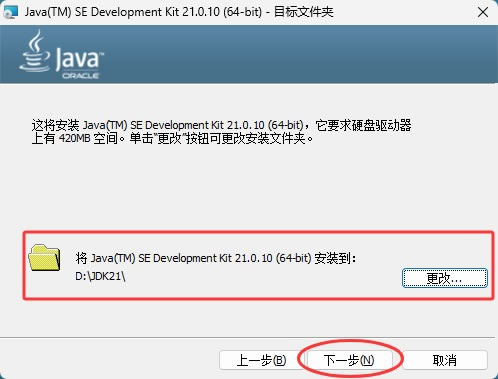2)点击"下一步"开始安装。默认安装到 C 盘,这里我将其安装到了非系统盘(比如 D:\JDK21\),注意,安装路径要记住,后面配置需要用到。