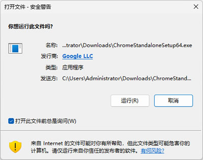 安装过程非常简单。双击安装文件后,Chrome会自动开始安装,通常不需要用户进行任何操作。系统可能会弹出下图所示的警告窗口,点击运行即可: