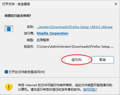 1)我使用的是 Windows x64 位系统,下载“Firefox Setup 149.0.2 x64.exe”安装包文件,双击启动,这时候系统可能会弹出下图所示的窗口,点击运行即可。