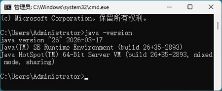 cmd打开命令提示符(cmd),输入"java -version"和"javac -version",如果显示JDK 26的版本信息,说明安装和配置成功。