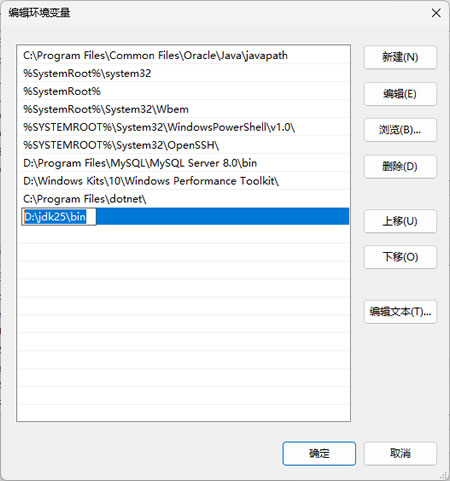 5)点击"新建",添加 JDK 的 bin 目录路径,我的是"D:\jdk25\bin":