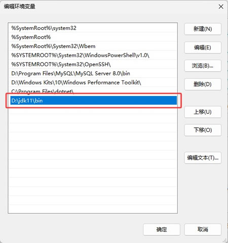 5)点击"新建",添加 JDK 的 bin 目录路径,我的是"D:\jdk11\bin":