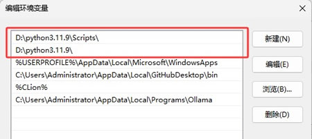 5)点击"新建",手动添加“D:\python3.11.9\” 和 “D:\python3.11.0\Scripts\”,将 Python 安装路径修改成自己的,然后单击确定按钮,就完成了对环境变量的设置。