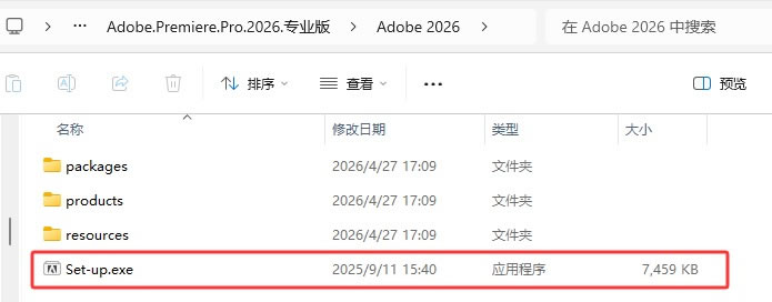 1)下载 .zip 压缩包后解压,跟随下图所示的路径找到 Adobe 2026 文件夹里的 set-up.exe 安装程序,双击执行: