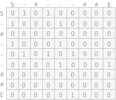 提示:1 表示有通路,0 表示没有通路,# 由于表示墙壁,同其它任何顶点之间都没有通路。