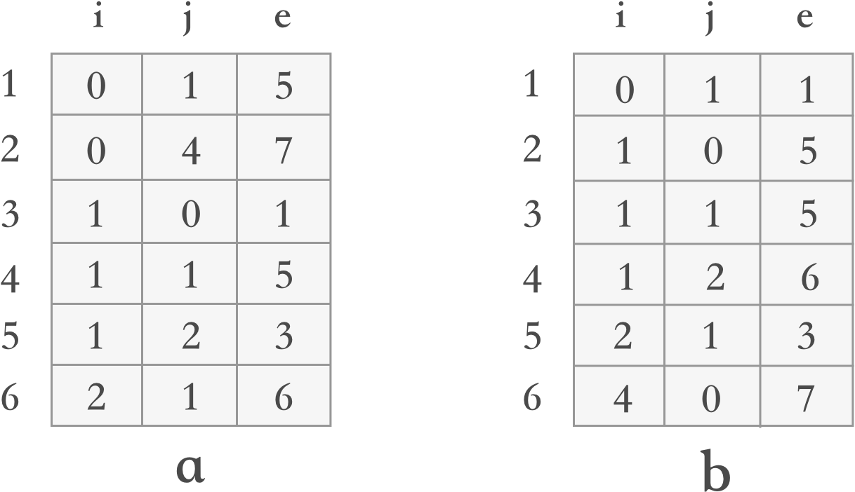 拿图 1 中的矩阵 A 和 B 来说,其各自用三元组顺序表表示(分别用 a 和b 表示),如下图所示: