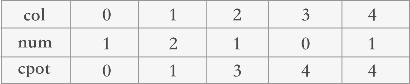 - cpot[col] = cpot[col - 1] + num[col -1],col 取大于等于 1 且小于 n 的数